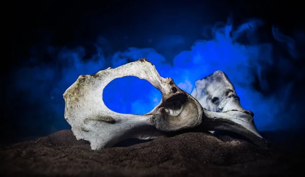 Animal bone in dark Halloween night with fog and light on background / Selective focus and space for text. Abstract horror concept