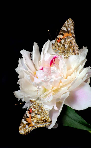 beautiful peony flower and butterflies isolated on black. close up. beautiful butterflies painted lady on flower. copy spaces.