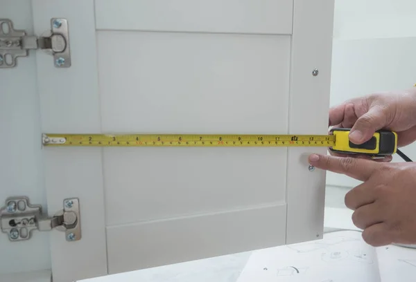 The mechanic assembled the furniture in the house according to the manual, along with the mechanic equipment. By hammering the nails Measuring with a tape measure Screwing the screw Drilling holes.