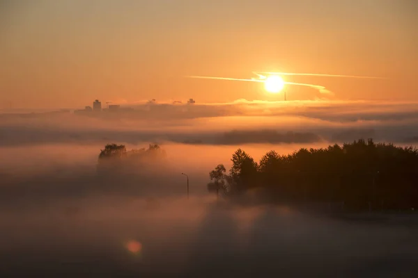 Bright beautiful dawn, the sun rises over the city, the light passes through the fog.