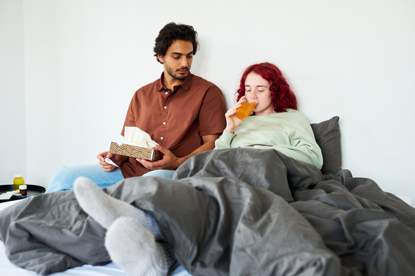 A Guy Is Holding Handkerchiefs While Girl with ARVI Is Taking Medicine