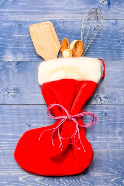 Great Christmas gift idea stuffed red sock. Kitchenware as wooden spoons and whisk lay in Christmas sock. Christmas gift concept. Kitchenware packed in big red sock, blue wooden background