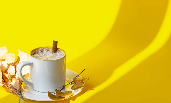 Autumn coffee or cappuccino composition. White coffee cup with milk foam, cinnamon stick and autumn leaves. Fall hot drinks, cafe and bar concept. Bright sunlight and shadows.