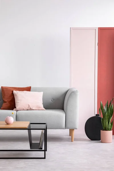 Pink and red screen on the white wall of elegant living room, modern coffee table and stylish couch with pillows next to plant in pink pot and black vase, real photo with copy space on the wall