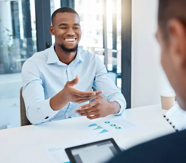 African man in business meeting with CEO planning corporate success strategy with graph and chart paperwork. Black businessman with idea presentation for boss or management leader at company office.