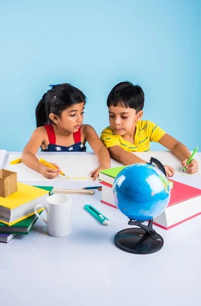 Indian boy and girl studying with globe on study table, asian kids studying, indian kids studying geography, kids doing homework or home work, two kids studying on table