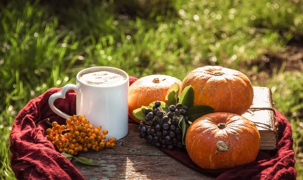 Autumn coffee. Pumpkin latte. Coffee in the autumn garden. Coffee mug, pumpkin and mountain ash.