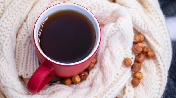 Autumn background with a red cup of coffee, tea, on the window, knitted scarf. Autumn coffee, dry leaves. Season October, November. Close-up.