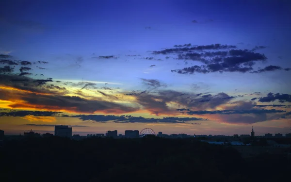Clouds in sunset sky against backdrop of high-rise city houses