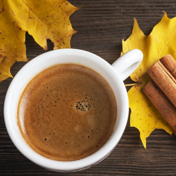 Autumn coffee cup. Closeup. Top view.