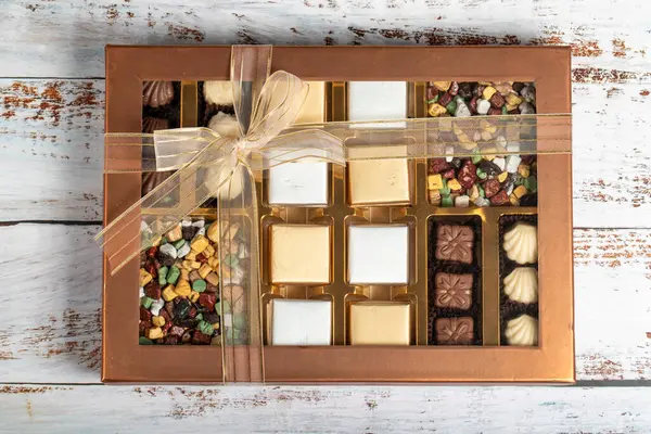 Packaged chocolate box. Pastry product. Gift chocolate box prepared with various chocolates on a white background. Top view