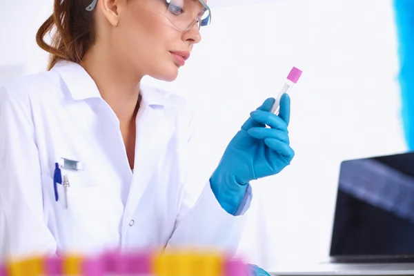 Woman researcher is surrounded by medical vials and flasks, isolated on white background