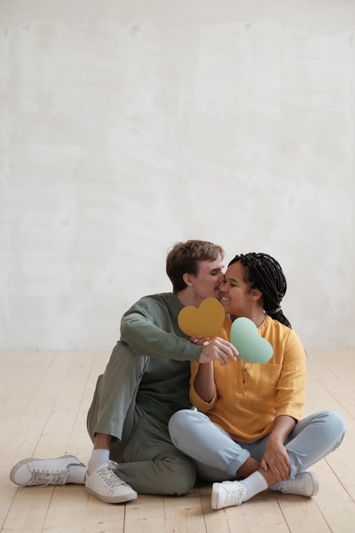 Man Kisses Sitting Woman Cheek