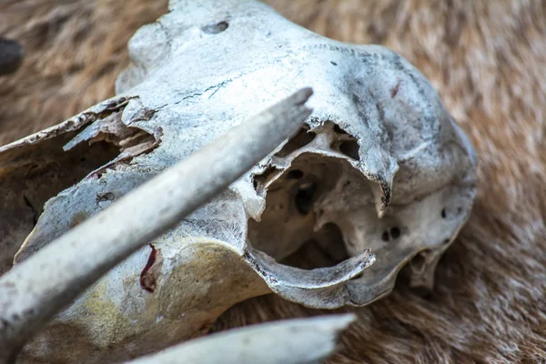 Scenery for Halloween - skulls and bones of animals. Scary and creepy decorations for All Saints Day