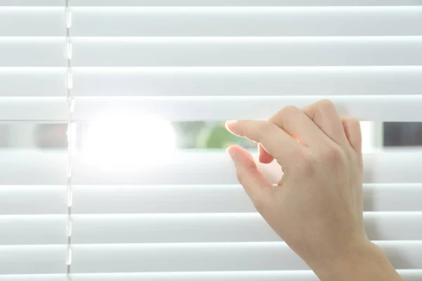 Young woman opening window blinds, closeup. Space for text