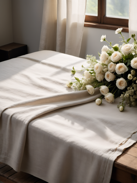 A Bouquet of White Roses Sitting on a Bed Next to a Window