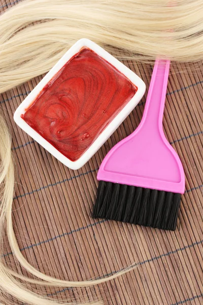 hair dye in bowl and brush for hair coloring on brown bamboo mat, close-up