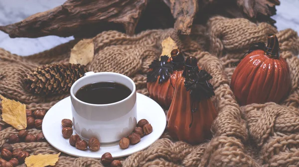 Autumn background with coffee, knitted scarf, pumpkin. Autumn coffee, dry leaves. Season October, November.