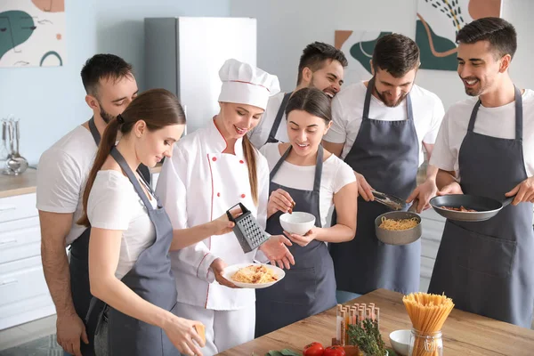 Female chef and group of young people during cooking classes