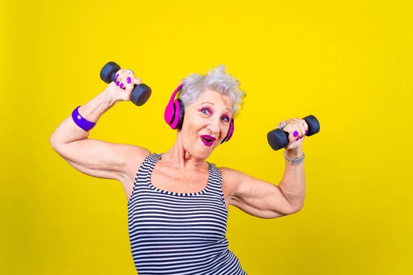 Elderly woman training using dumbbells on yellow background having fun - Isolated mature woman stretching using gym weight listening music - healthy, sport, training concept