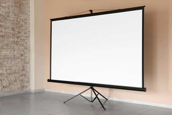 Modern projector screen near wall indoors