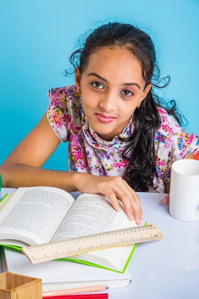 Education and home concept - stressed student girl with books, indian girl child tired of studying or doing homework, asian girl studying and stressed, with globe toy and coffee mug