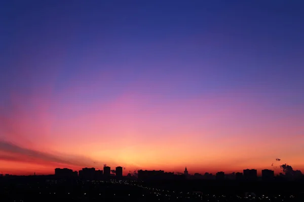 Sunrise over the city, scenic view. Pink-blue sky in soft colors sky above silhouettes of high-rise buildings, colorful cityscape for background