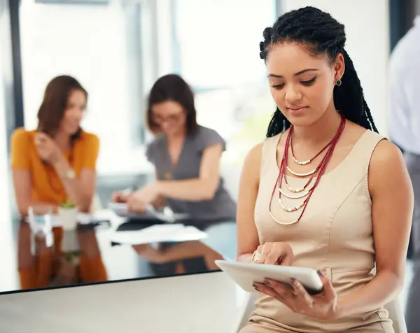 African woman, tablet and meeting in office for research, collaboration and planning with kpi tools. Business employee, tech and app in workplace for networking, communication and teamwork with staff.