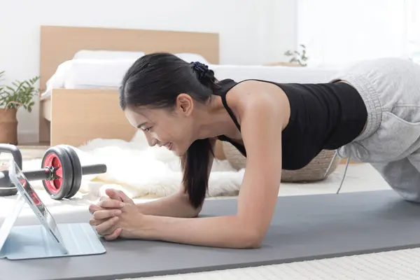 Asian woman doing plank fitness on yoga mat on bedroom floor. Happy female works out with in front of bed at home. Beautiful sporty girl plank workout exercise. Healthy sport lifestyle hobby.