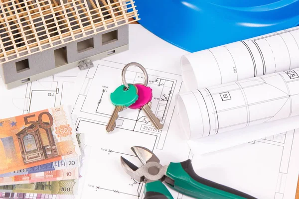 Currencies euro, home keys, electrical drawings or diagrams for engineer jobs and house under construction, concept of building home cost