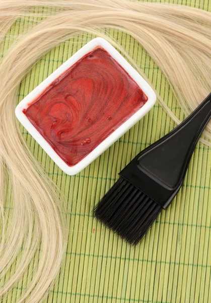 Hair dye in bowl and brush for hair coloring on green bamboo mat, close-up