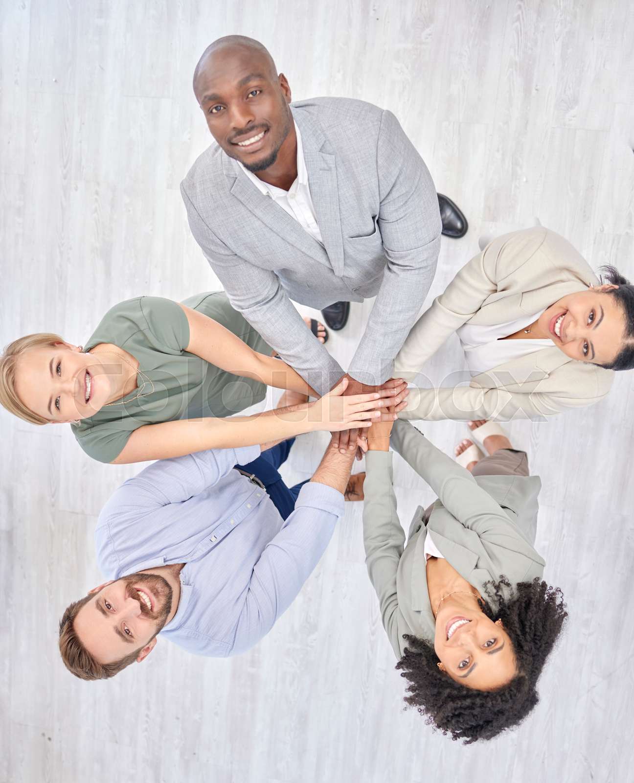 Teamwork, overhead and business people in diversity, support and solidarity together hands stacked in office. Successful, success and portrait of collaboration by corporate team or staff in community