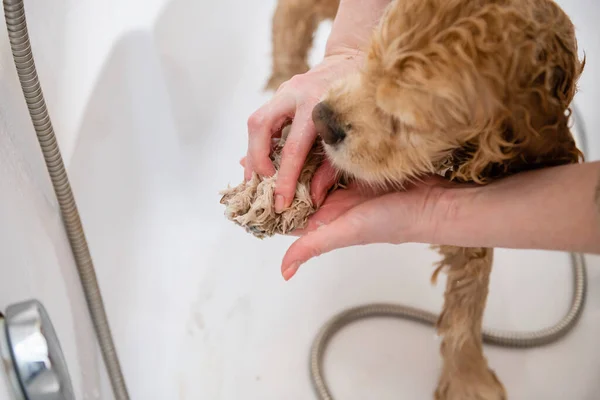 Groomer washing dog's paws in bathroom. First person view. A female hand washes a spaniel's paw with shampoo.