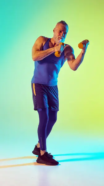 Kickboxing. Full-length of elderly sportive man training with dumbbell against gradient green yellow background in neon light. Concept of sport, active elderly lifestyle, health care
