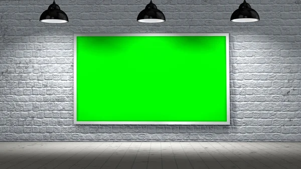 Green screen frame on old brick wall and wooden floor illuminated with spotlight