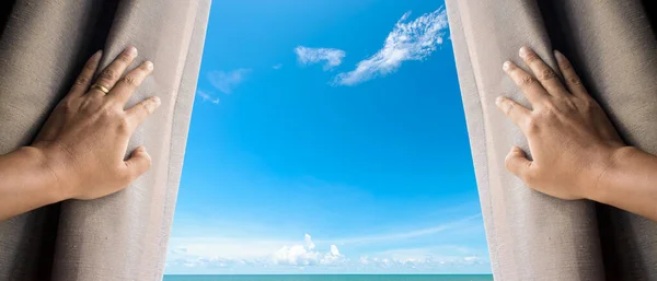 Hope concept . Man opening window curtains and seeing the blue sky above the sea
