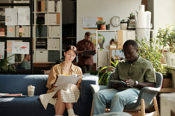 A Man Uses a Tablet Sitting next to a Colleague with Documents