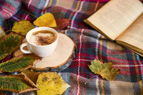Autumn coffee cup with cozy blanket, fall deco warm home weekend