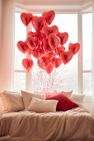 A Bed with Pillows and a Window with Red Heart Balloons
