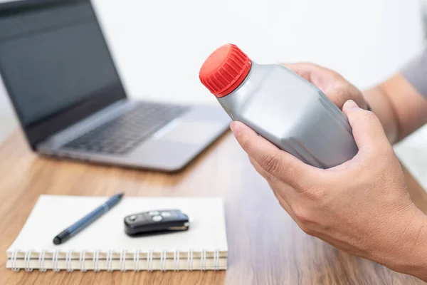 Close up hand car service staff check the details of the engine oil to meet the needs of customers in the service of car mileage checks and notebook laptop on table