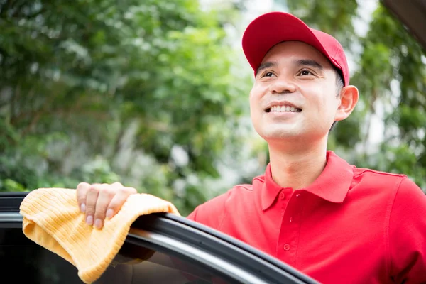 Smiling auto service staff thinking(daydreaming) while cleaning