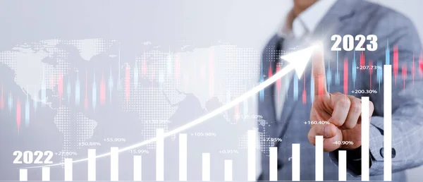 Business growth data chart arrow with diagram 2023 budget, Businessman pointing arrow graph corporate future growth year 2022 to 2023, Development to success and motivation.