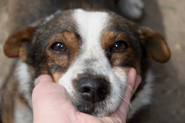 A sad expression of beautiful dog eyes with a tear. A very sad picture of a dog without a master.