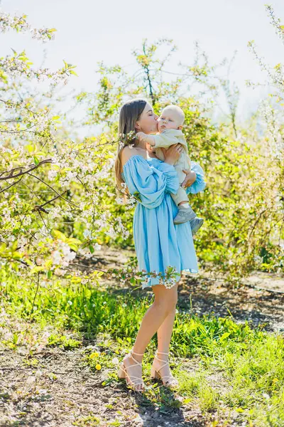 A young happy mother holds her little son in her arms while standing in nature. A walk with a child. Mother on maternity leave on a walk with a baby.