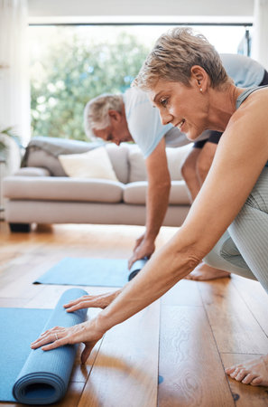 Senior couple, rolling yoga mat and home workout, fitness and exercise on living room floor. Elderly people on lounge ground for pilates training, healthy lifestyle and balance body wellness together