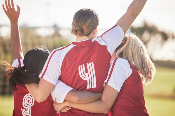 Female football team celebrating winning, goal or teamwork effort at a game, tournament or during practice on a field outdoors. Behind of women with arms raised in celebration, victory and joy.