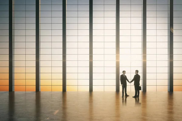 Businessmen shaking hands in large office with sunrise view. Teamwork and business concept