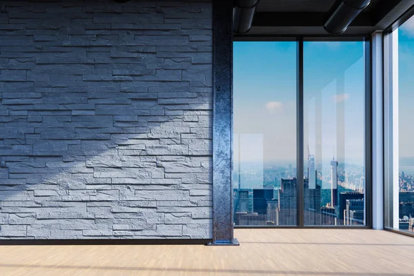 large office blank white wall and copy space in front of panoramic window skyline view, 3D Illustration