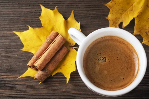 Autumn coffee cup with copy space. Top view.