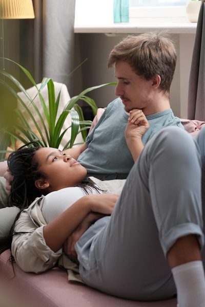 Couple Looks at Each Other Laying on Counch